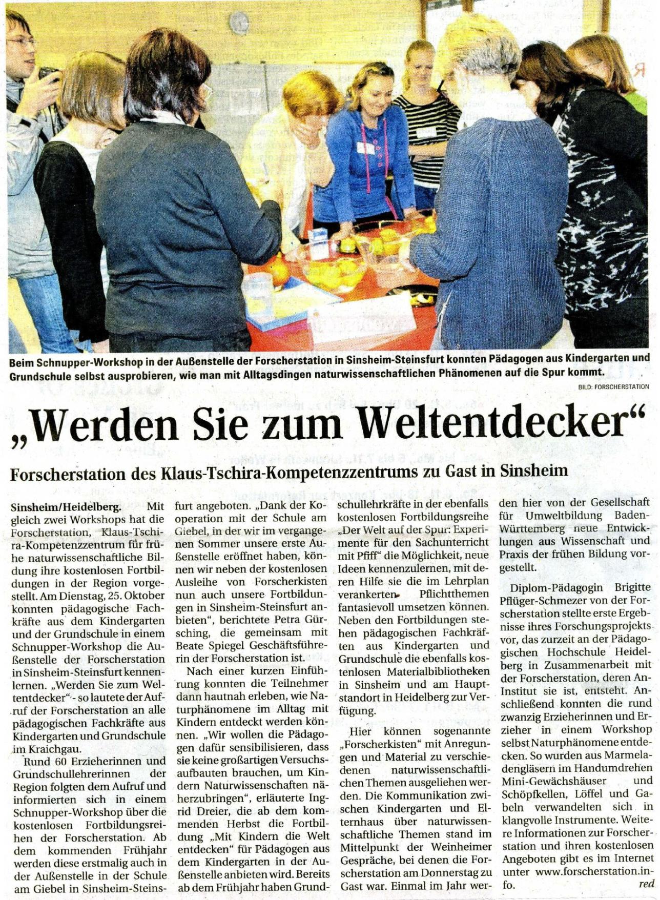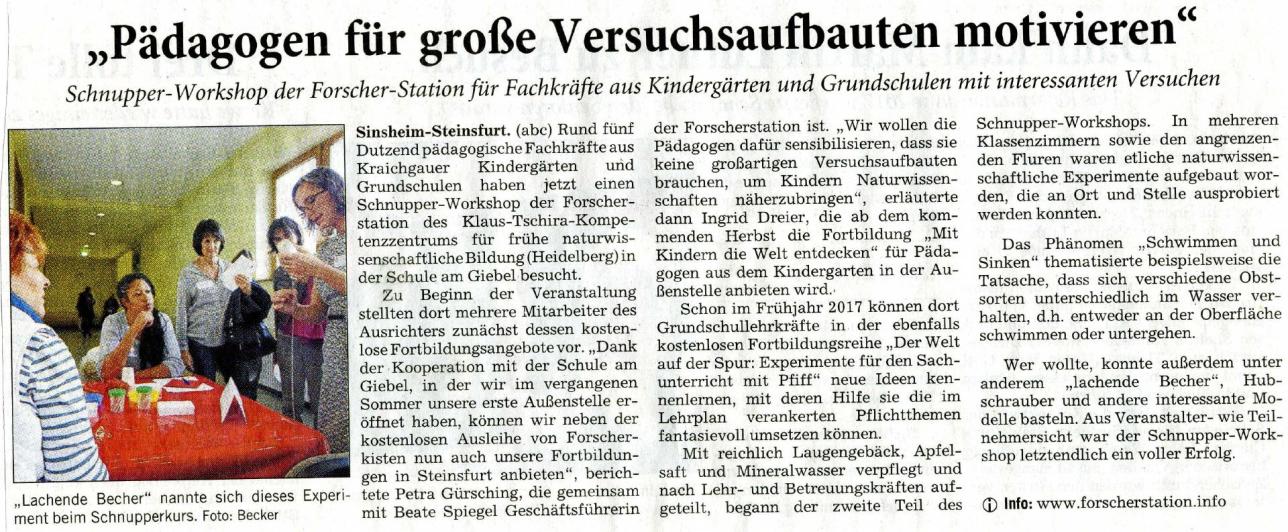 Im Rahmen der seit 2015 bestehenden Kooperation zwischen der Schule am Giebel und der Forscherstation finden in Sinsheim-Steinsfurt Fortbildungen der Forscherstation statt.